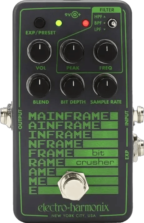 The Electro-Harmonix Mainframe is a bit crusher effects pedal that delivers adjustable sample rate reduction from 48kHz down to 110Hz, allowing for a range of digital distortion effects. Bit depth can also be controlled, producing characteristic low-fi textures. The pedal includes selectable sample rate and bit depth parameters, as well as a filter control for further tonal shaping. Additional features include expression pedal input for hands-free control and a selectable buffer or true bypass switching. The Mainframe effects pedal is built for modern rig integration and offers compatibility for bass instruments.