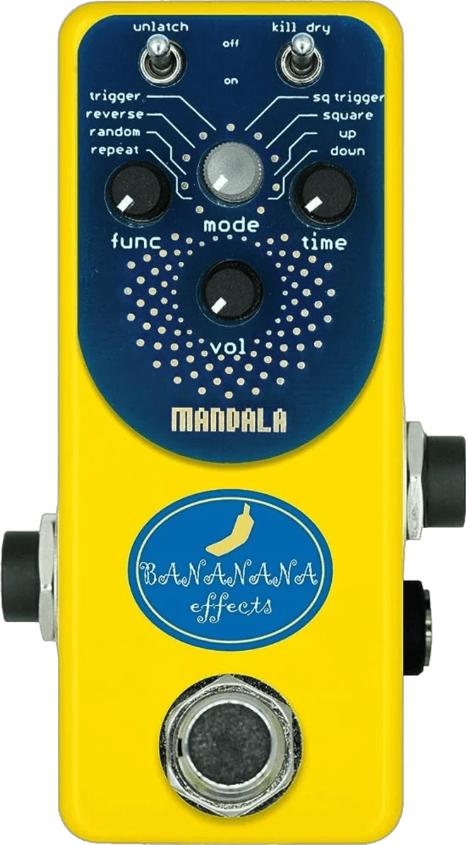 The Bananana Effects Mandala is a multi-function glitch effects pedal designed for sound experimentation and real-time audio manipulation. It offers eight selectable modes, providing access to multi-speed playback, pitch shifting, square wave effects, and a delay function that automatically captures and loops the previous phrase when it detects silence in the input signal. This glitch pedal is tailored for musicians looking for extensive control over creative sound processing.