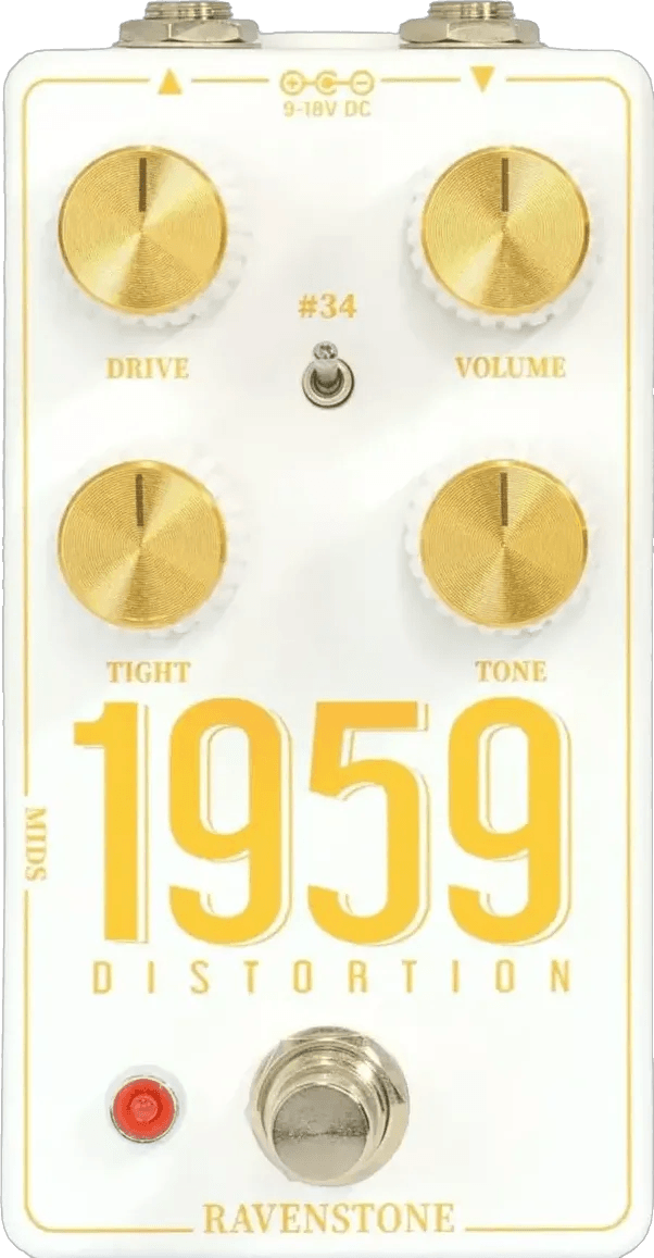 The Ravenstone 1959 Distortion pedal is an effects pedal designed to emulate the classic distortion tones of Marshall Bluesbreaker, Super Lead Plexi, and JCM800 amplifiers. This analog distortion pedal produces tones associated with a variety of well-known rock and metal sounds, with a focus on accurate amp-style response and articulation.