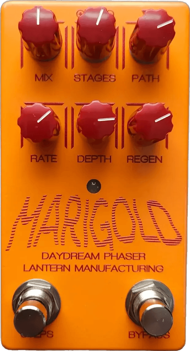 The Lantern Manufacturing Marigold is an OTA-based analog phaser pedal offering a wide range of modulation effects, including standard and inverted phasing, phase shift vibrato, and step-sequenced modulation. It utilizes an exponentiated triangle LFO for its phase shifting, with standard and stair-step modes selectable for varied modulation textures. The Marigold’s “soft turn” rotary selectors provide precise control over its Stages and Paths, allowing for custom combinations of phase shifting and feedback. LFO speed ranges from approximately 15 seconds per cycle to 200 milliseconds per cycle.