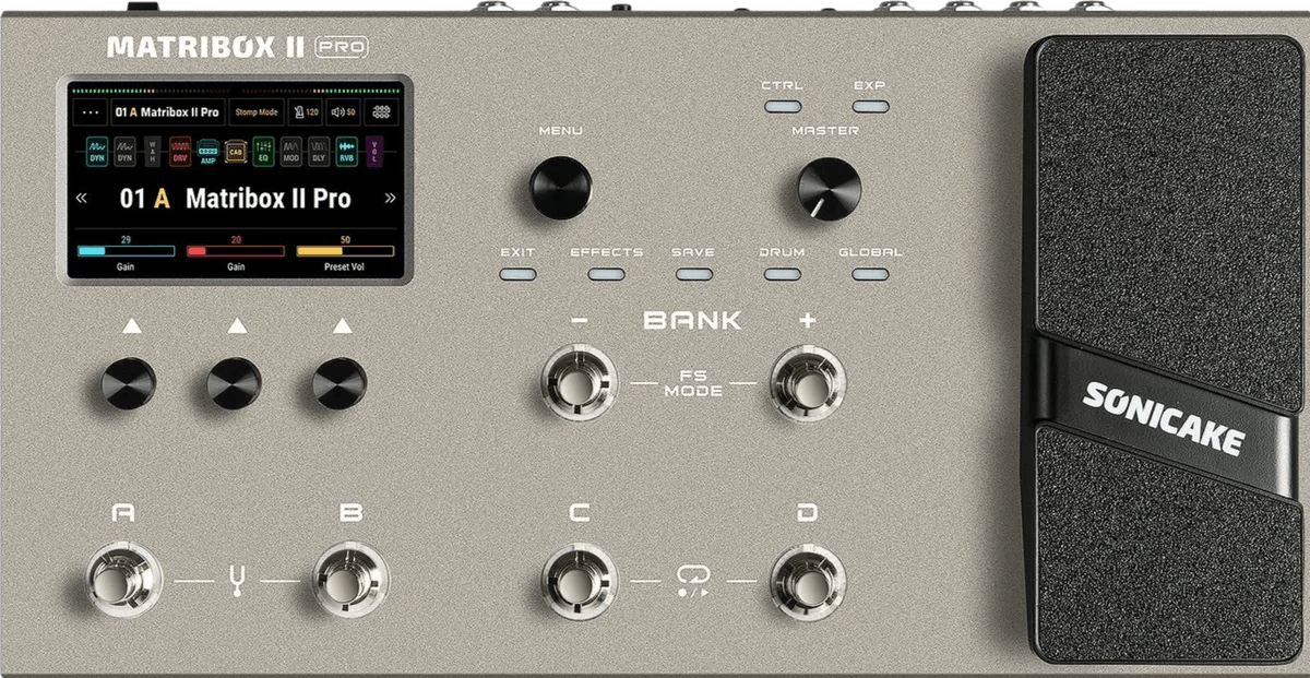 The Sonicake Matribox II Pro is a multi-effects processor designed for use with electric instruments. This effects processor features an upgraded hardware platform with advanced digital modeling, providing a wide range of effect types and signal chain options. The integrated touch screen offers an intuitive interface for editing and managing presets. Additional footswitches and expanded connectivity, including multiple pedal and input/output options, enable flexible control and versatile integration into different setups.