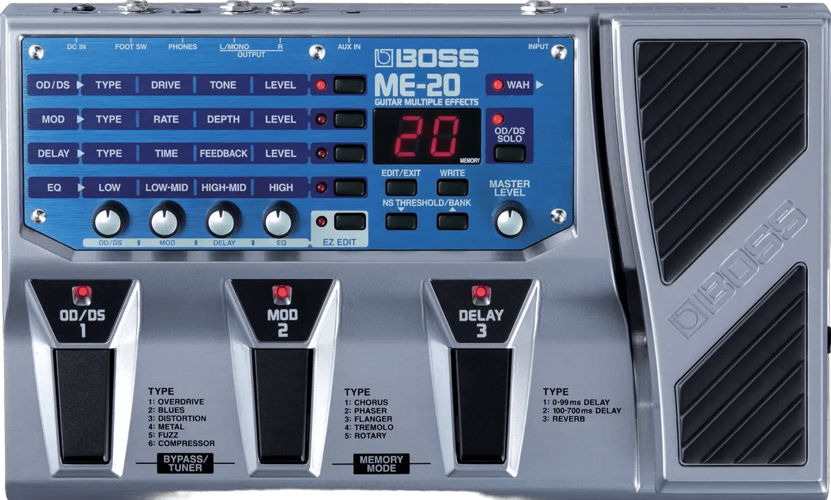 The BOSS ME-20 is a multi-effects floor unit designed for live performance, combining a range of essential BOSS effects in one pedalboard. This BOSS multi-effect pedal delivers overdrive, distortion, delay, chorus, phaser, flanger, tremolo, rotary speaker, and EQ effects. Featuring a straightforward interface and rugged construction, the ME-20 provides musicians with a robust solution for accessing a wide array of classic BOSS tones. All effects are easily selectable via dedicated footswitches, supporting efficient and reliable stage operation.