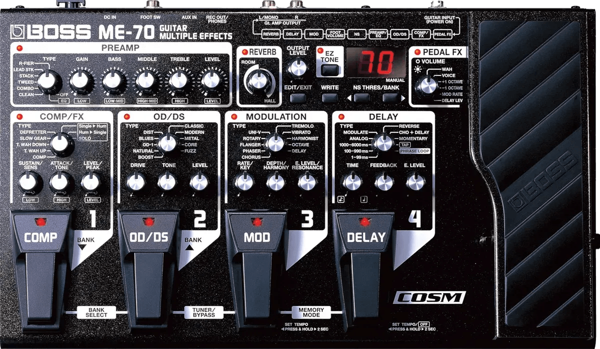 The Boss ME-70 is a multi-effects pedal that delivers a wide range of guitar effects in a compact, stompbox-style interface. Featuring a hands-on control layout, the ME-70 includes a COSM amp modeling section based on the GT-10 processor, allowing for comprehensive tone shaping. This Boss effects pedal provides easy access to multiple effect types, including distortion, modulation, delay, reverb, and more, making it a versatile option for a variety of setups. The unit is designed with user-friendly, knob-based controls, enabling direct editing without menu navigation.