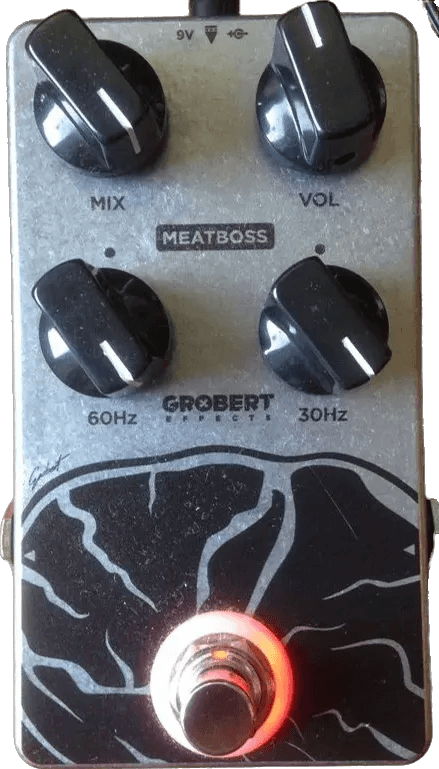This pedal is a true bypass analog subsynth effects pedal, designed as a 1:1 clone of the original DOD FX-32 Meatbox (not the reissue). It produces a synthesized lower octave effect, extending down to approximately 20Hz. Two dedicated controls, 30Hz and 60Hz, function as bell/notch filters that are neutral at 12:00 and boost sub frequencies as they are turned clockwise. The Mix control adjusts the blend of the low-frequency synthesized signal with the dry input. The Volume knob governs the overall output, with an increased maximum output level compared to the original pedal design.