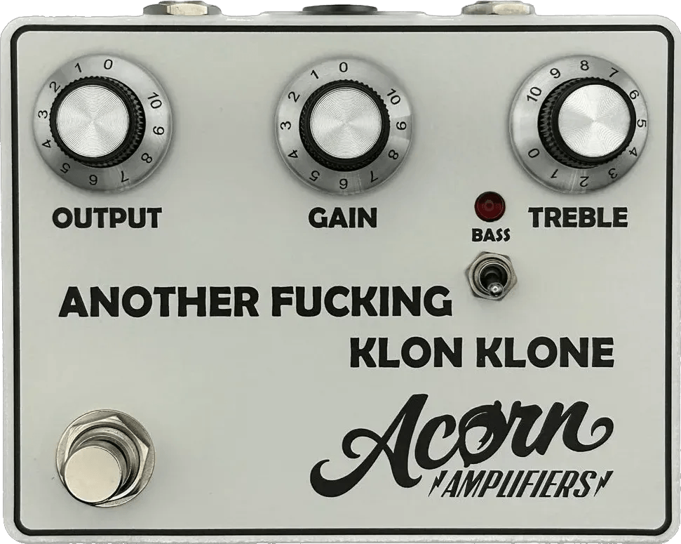 The Acorn Amplifiers Another F#%king Klon Klone is an overdrive effects pedal designed to deliver classic Klon-style tonal characteristics. This handmade overdrive pedal replicates the circuitry and response of the iconic transparent overdrive, offering nuanced gain control and natural harmonic enhancement. Core features include traditional simple controls for gain, treble, and output, housed in a robust, compact enclosure. True bypass switching ensures no tone coloration when the pedal is disengaged. Suitable for use in a range of pedalboard setups, this Acorn Amplifiers effects pedal provides the legendary overdrive response sought by many musicians.