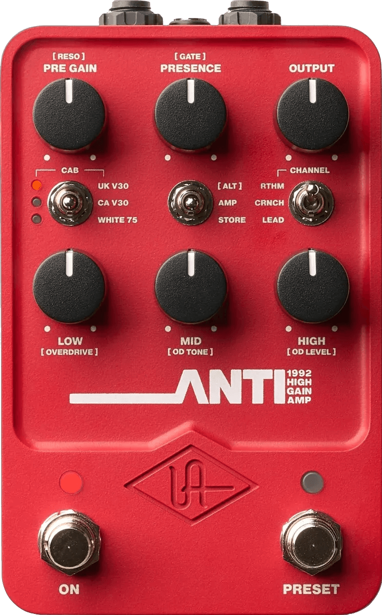 The Universal Audio UAFX ANTI 1992 High Gain Amp is a high-gain amp-in-a-box effects pedal designed to emulate the signature tone of 120-watt tube amplifiers commonly found in Scandinavian metal and modern heavy genres. This distortion pedal captures a range of tones from aggressive, scooped distortion to clean amp sounds and features integrated cabinet simulations derived from professionally miked speaker setups. The pedal is housed in a rugged enclosure and offers true bypass switching for transparent signal flow when the effect is not engaged.