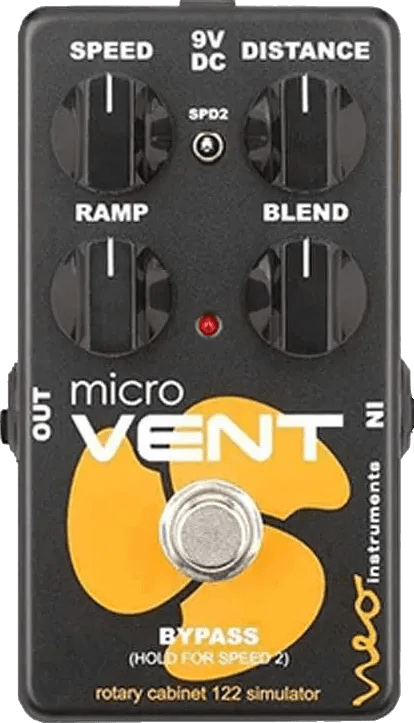 The Neo Instruments micro Vent 122 is a rotary speaker effects pedal designed to emulate the sound and spatial characteristics of the Leslie 122 rotary speaker. Utilizing advanced algorithms, this pedal simulates a dual microphone setup—one capturing the horn, the other the drum rotor—providing users with authentic stereo rotary sounds. The pedal features a DISTANCE control, allowing adjustment of virtual microphone placement for tailored depth and movement. The micro Vent 122 provides true bypass switching and is engineered for compatibility with electric bass instruments.