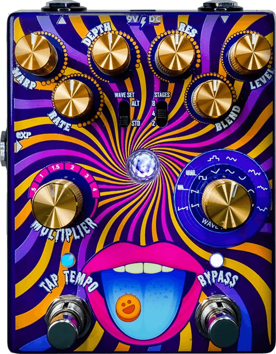 A dedicated tap tempo footswitch provides real-time control over modulation speed. The Microdose supports expression pedal input for hands-free manipulation of parameters, and features true bypass switching to maintain signal integrity when the pedal is disengaged.