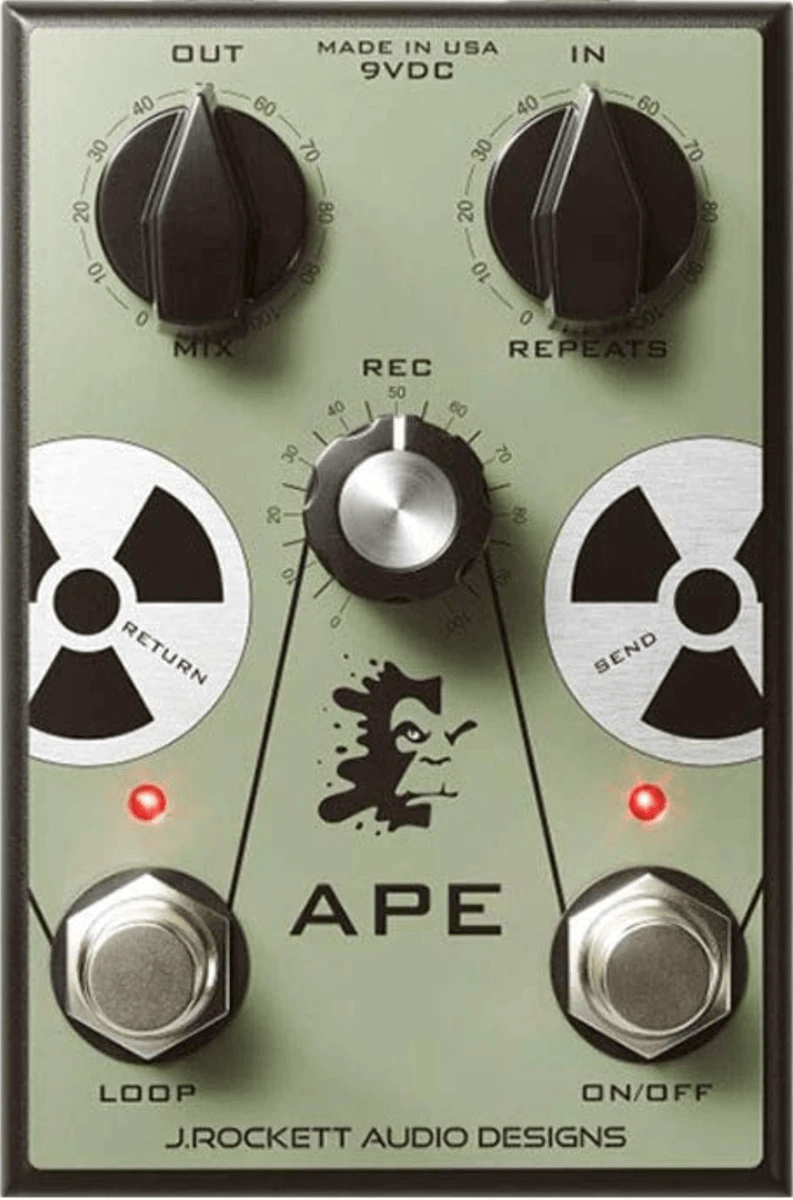 The J. Rockett Audio Designs APE is an analog preamp effects pedal engineered to replicate the complete vintage tape echo preamp circuit, including tonal coloration from the classic tape head design. Operating at 22.5 volts, this pedal provides analog saturation and EQ shaping based on classic tape delay units. The APE incorporates series and send/return connectivity, variable gain for adjustable overdrive or clean boost, and dedicated controls for tailoring the amount of warmth, EQ contour, and harmonic distortion applied to the input signal.