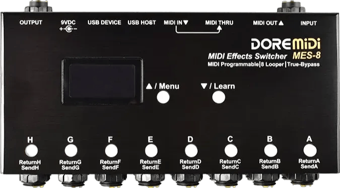 The MES-8 MIDI effects switcher is a programmable MIDI controller for managing up to eight audio effects loops with true bypass switching. This MIDI switcher can store and recall up to 160 effect loop combinations and responds to a wide range of MIDI message types by learning incoming MIDI commands. The MES-8 supports control via standard MIDI five-pin DIN connections, USB MIDI devices, and computer-based MIDI systems. Features include a true bypass circuit to maintain signal integrity and a built-in buffer to enhance audio output.