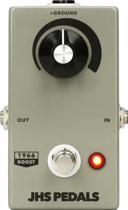 The JHS 1966 Series Boost is a germanium treble boost effects pedal designed to emulate the character of classic 1960s booster circuits. This boost pedal uses hand-selected germanium transistors and high-grade carbon composition resistors, capturing the original vintage mid/high-frequency push that was used to drive British amplifiers into overdrive or distortion. The circuit operates with true bypass switching and features a vintage positive ground voltage. Power options include an internal battery snap or an isolated standard 9V pedal power supply (do not daisy-chain with typical negative ground pedals). The pedal is designed to be first in the effects signal chain due to its input impedance requirements. An added power supply filter capacitor and switch pop-reducing pull-down resistance help improve noise performance and switching.
