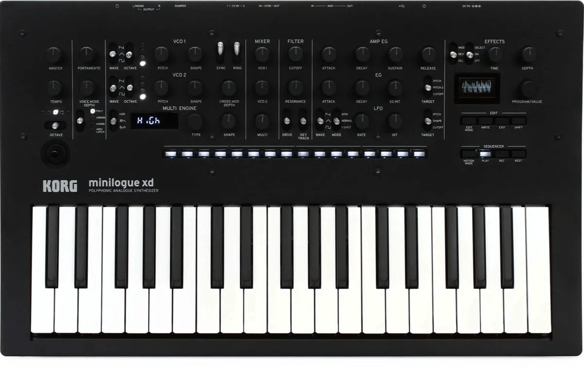 The Korg minilogue xd is a polyphonic analog synthesizer combining analog synthesis with digital multi-engine features for expanded sound creation. This synthesizer builds on the original minilogue by adding digital effects, an enhanced sequencer, and micro tuning options, offering flexible control and extensive sound design capabilities. The minilogue xd’s analog signal path is complemented by a digital oscillator, as well as onboard modulation and customizable tuning.