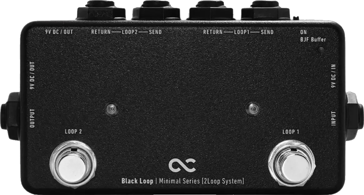 The One Control Minimal Series Black Loop is a dual-loop true bypass effects pedal switcher designed for flexible pedalboard routing and signal management. This pedal functions as a two-loop true bypass looper, AB box, or tuner output/mute switch. It features two DC barrel power outlets for pedal power management and includes the BJF Buffer circuit, which can be engaged or bypassed to maintain signal clarity in complex setups. The Black Loop enables removal of effects pedals from the signal chain when not in use and facilitates easy switching or muting.