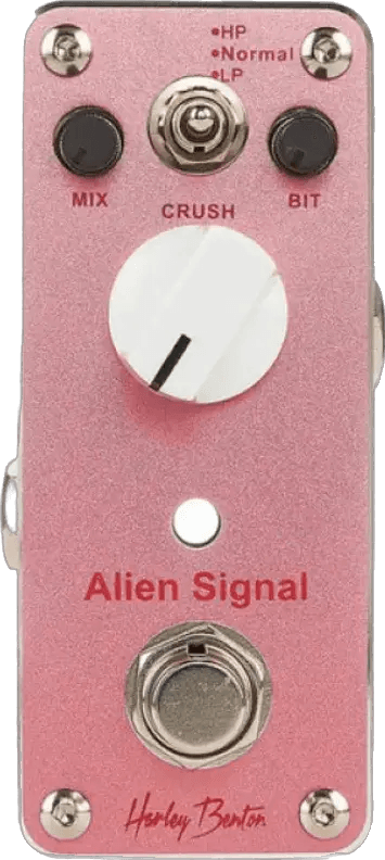 The Alien Signal is a bit crusher effects pedal designed for transforming instrument signals with a range of digital distortion and lo-fi textures. This compact stompbox allows users to manipulate their sound, producing everything from heavy, buzzy digital artifacts to nuanced layers of noise and subtle bit reduction. Housed in a durable metal enclosure, the pedal features true bypass switching, ensuring that your signal remains unaffected when the pedal is off.