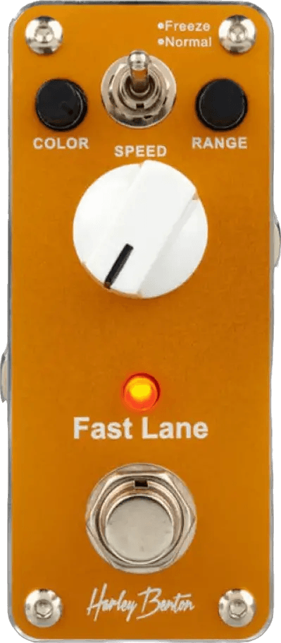 The Fast Lane is a compact analog flanger effects pedal designed to deliver classic flanging tones by blending your input signal with a modulated delay. This stompbox offers three control knobs—Depth, Rate, and Regeneration—providing a wide range of flanger sounds, from sweeping jet effects to subtle, atmospheric modulation. The Rate control enables slow vibrato or faster Leslie-style movement, while the Regeneration control shapes feedback intensity. Featuring a Freeze mode, this pedal allows static snapshots of the flanged signal for extended creative options.