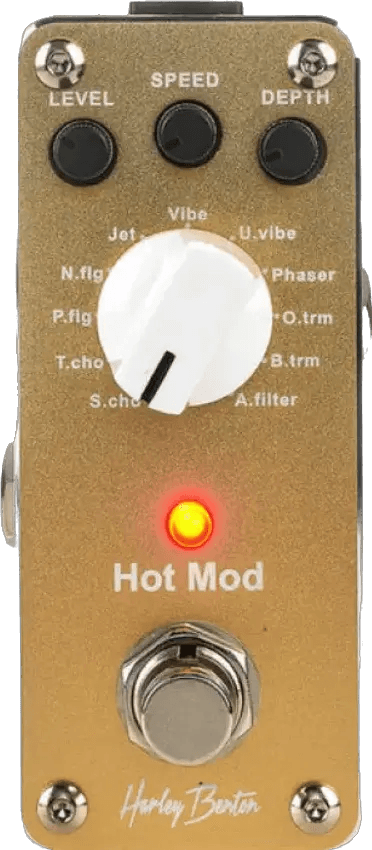 The **Hot Mod** is a compact multi-modulation effects pedal offering a wide range of classic and modern modulation sounds, including chorus, flanger, auto-wah, tremolo, phaser, rotary, and ring modulation. Three dedicated mini controls allow precise adjustment of modulation depth, rate, and effect character. The pedal features a durable metal chassis and true bypass switching to maintain signal clarity when disengaged.