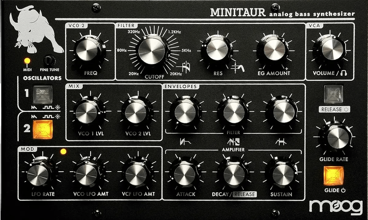 The Moog Minitaur is a compact analog bass synthesizer module designed to generate powerful subharmonic low-frequency tones. Engineered for seamless integration into both live and studio environments, this bass synth features classic Moog analog circuitry for rich, deep bass sounds. The unit supports computer-based setups via USB and MIDI connectivity, providing flexible control options for various music production workflows.