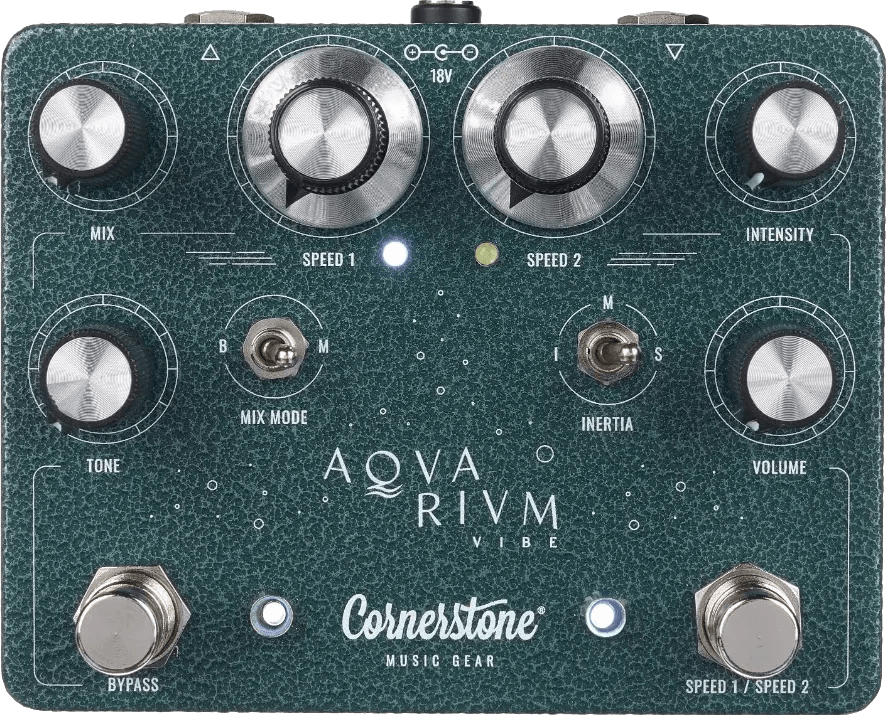 The Cornerstone Music Gear Aquarium is a Univibe-style modulation pedal designed to deliver the signature wobbling vibe effect while addressing common limitations of classic circuits. This modulation effects pedal offers rich, swirling textures without the typical volume drop or tone coloration found in vintage Univibe pedals. Aquarium features modern circuitry and control layout for consistent audio performance, and maintains the tonal integrity of your signal. True bypass switching ensures the signal remains unaffected when the pedal is disengaged.