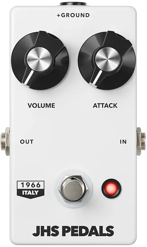 The JHS 1966 Series Italy is a germanium fuzz effects pedal, designed to authentically reproduce the characteristics of the early Italian-made Vox Tonebender circuit. This fuzz stompbox features a circuit architecture based on the period between 1966 and 1968, utilizing hand-matched germanium transistors, carbon composition resistors, and oversized capacitors. The pedal delivers sharp, articulate fuzz tones with relatively lower output volume, offering tonal characteristics that fall between the Arbiter Fuzz Face and Rangemaster boost circuits. It incorporates true bypass switching and an intuitive pot taper for control adjustments, with added internal filtering for reduced noise. The circuit uses vintage positive ground voltage, so isolated power supply use is recommended. Every pedal batch may sound slightly different due to natural transistor and component tolerances.