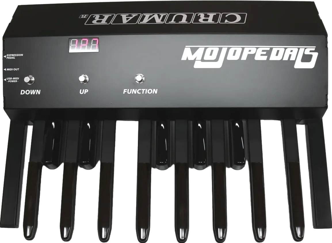 The Crumar MojoPedals is a 13-note MIDI pedalboard controller designed for use with MIDI-compatible instruments and devices. This MIDI controller pedalboard features velocity-sensitive metal pedals for enhanced playing dynamics and integrates easily into organ setups or any system requiring MIDI note or control data input.