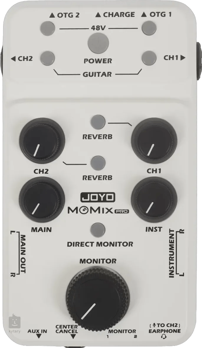 The MOMIX PRO is a portable audio mixer designed for live streaming and recording, offering two vocal/guitar channels and a dedicated stereo instrument input. The updated model features a dual-channel reverb function to enhance clarity and presence on vocals or guitar during performance or recording. Compatible with guitar tone apps, this audio mixer supports setups for three- or four-piece bands. The built-in rechargeable lithium battery enables mobile operation and can also be used to charge a smartphone for extended outdoor sessions.