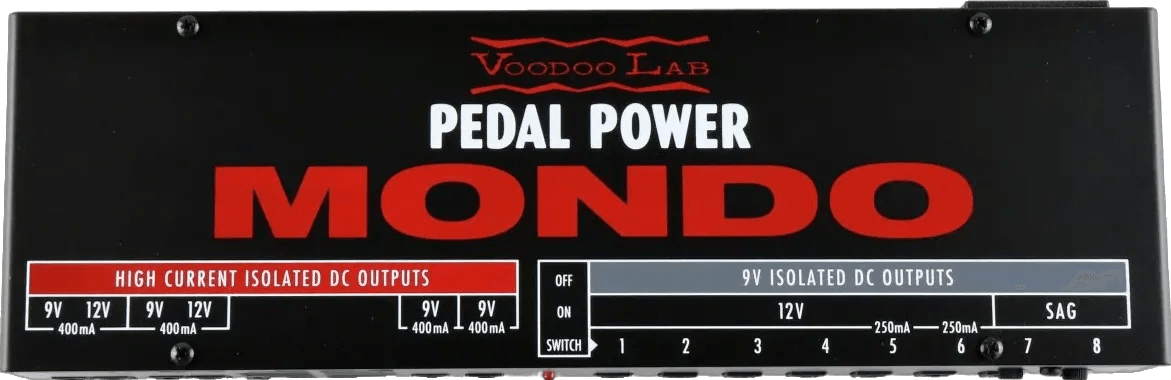 The Voodoo Lab Pedal Power MONDO is a high-current pedalboard power supply engineered to support large and varied collections of effects pedals, including digital effects and standard 9V stompboxes. This unit provides 12 fully isolated, filtered, and regulated outputs, helping eliminate unwanted noise from digital switching power supplies. The Pedal Power MONDO includes an integrated temperature-controlled fan for cooling, ensuring reliable performance even in challenging environments. It also maintains stable power delivery regardless of AC line fluctuations.