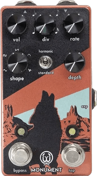 The Walrus Audio Monument Tremolo pedal is a dual-mode effects unit offering both harmonic tremolo and standard tremolo operation. This modulation effects pedal generates a range of tremolo textures, producing everything from subtle, smooth amplitude undulations to sharp, jagged pulses. Controls include rate, depth, shape, and division, allowing adjustment of modulation speed and waveform type. The pedal includes tap tempo functionality for precise rate control and supports mono operation. True bypass switching ensures signal integrity when disengaged.