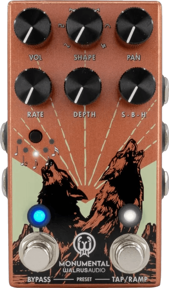 The Walrus Audio Monumental Harmonic Stereo Tremolo is an analog optical tremolo pedal designed to deliver both standard and harmonic tremolo effects with flexible modulation options. The pedal offers stereo output and a dedicated pan control for adjusting the spread of the tremolo effect across left and right channels. Key features include onboard preset storage, seamless blending between traditional and harmonic tremolo modes, updated wave shape selections, and tap tempo with adjustable tap divisions.