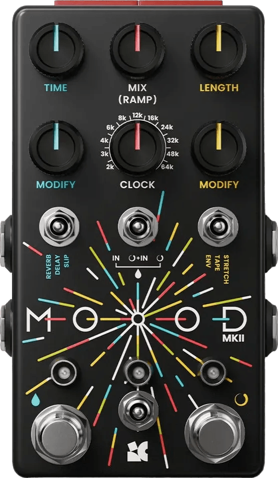 The Chase Bliss MOOD MKII is a stereo multi-effects pedal designed for both looping and real-time processing. This effects pedal features two interactive channels, allowing users to sample and loop short audio phrases while simultaneously applying spatial effects. The two channels work together, enabling dynamic manipulation of audio, from freezing and scattering textures to combining different effects. The MOOD MKII provides a range of controls for shaping sound and offers true bypass switching for signal integrity. Stereo output and deep parameter control options make it suitable for complex sound design and live performance settings.
