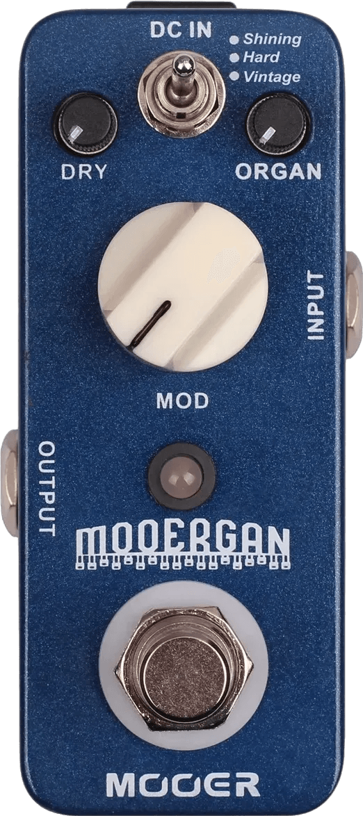 The Mooer Mooergan is an organ simulator effects pedal that transforms an instrument signal to emulate traditional rotary speaker cabinets. This Mooer effects pedal offers three selectable organ voice modes: Shining, Hard, and Vintage, each delivering a distinct tonal character based on classic organ speaker sounds. Designed for straightforward pedalboard integration, the Mooergan features standard mono input and output connectivity. True bypass switching preserves your original signal when the effect is disengaged.