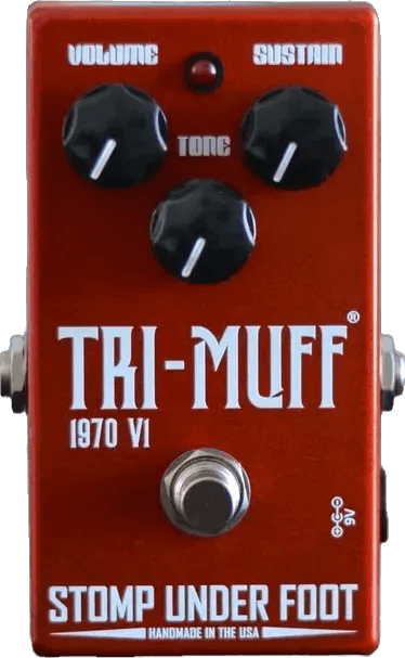 The Stomp Under Foot 1970 Tri-Muff V1 is a vintage-style fuzz stompbox based on early Triangle Big Muff circuit designs. This analog fuzz pedal produces saturated, woolly distortion with prominent low-end response and harmonically rich sustain. Controls include Volume, Tone, and Sustain, allowing for adjustment of output level, frequency emphasis, and the intensity of fuzz. The circuit’s true bypass design preserves your signal integrity when disengaged. The Tri-Muff V1 is built for players seeking a classic “Triangle Muff” fuzz character, featuring a gritty breakup in low registers and smooth, blooming sustain for melodic leads.