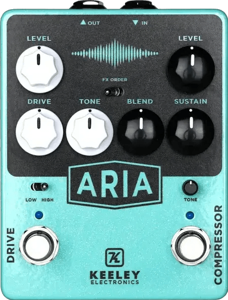 The Keeley Aria Compressor Drive is a combined compressor and overdrive effects pedal, merging the Keeley Compressor circuit with the Red Dirt Overdrive in a single unit. This dual-function stompbox allows users to select the order of the compression and drive stages, providing expanded tone-shaping options. A mode toggle offers both high-gain and low-gain drive selections, while dedicated controls for volume, tone, and drive enable precise adjustment. The pedal features a blend control for the compressor section and incorporates a treble recovery circuit to maintain clarity. TRS insert jacks provide connectivity for external effects between the compressor and drive, increasing signal chain flexibility.