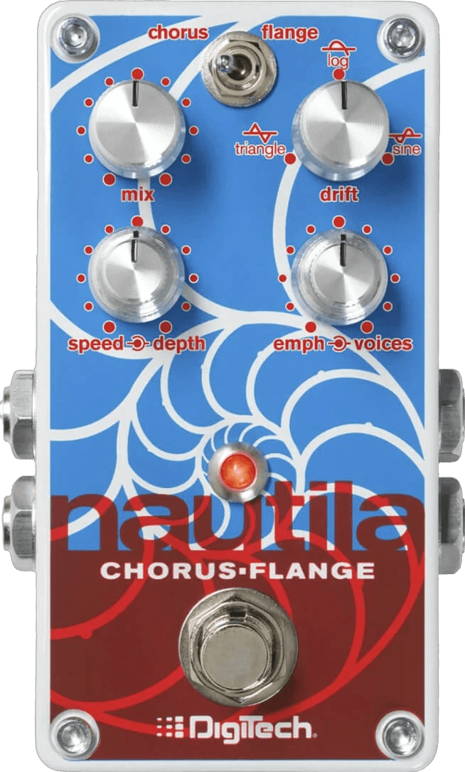 The Nautila Chorus/Flanger is a stereo modulation effects pedal designed to deliver both chorus and flanger sounds with flexible real-time manipulation. This Digitech effects pedal features dedicated controls for Speed, Depth, Emphasis, Voices, and Mix. The Voice control enables selection of up to eight chorus or four flanger voices, while the Drift knob allows waveform blending and morphing during performance. Modulation speed can be adjusted on the fly by holding the momentary footswitch. The unit offers true bypass switching, stereo input and output, and silent switching. Powered by a standard 9VDC power supply, it integrates easily into most pedalboards.