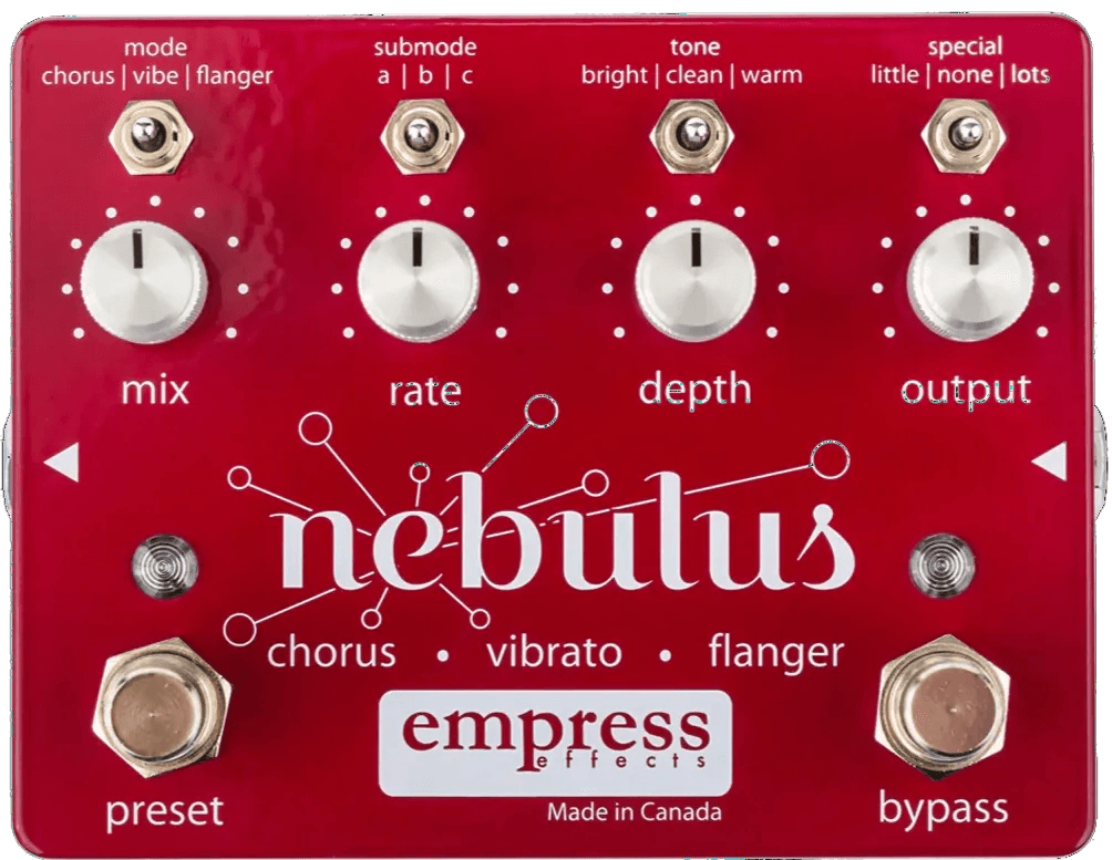 The Empress Nebulus is a multi-effects pedal that delivers chorus, flanger, and vibrato effects in a compact format. This modulation effects pedal features three selectable variations per effect type, providing a total of nine unique, adjustable modes. With onboard preset storage, users can save and access up to eight custom settings for quick recall during performance or studio work.