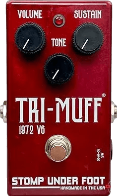 The Stomp Under Foot 1972 Tri-Muff V6 is a fuzz effects pedal inspired by the classic Triangle circuit. Built with period-correct resistors and capacitors, this fuzz stompbox delivers high-gain fuzz tones characterized by a textured, gritty response. The pedal features a tight low-end and a pronounced high-end, with harmonics that respond dynamically to playing technique. Controls include standard volume, tone, and sustain. True bypass switching ensures that your signal remains unaffected when the pedal is disengaged.