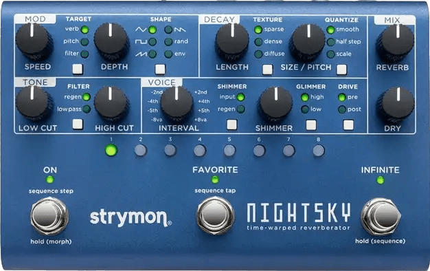 The Strymon NightSky is a reverb effects pedal designed for advanced sound design and real-time pitch and harmonic control. This reverb synthesis workstation allows users to shape and manipulate reverb tails using features like pitch shifting, core size adjustment, and harmonic modulation, alongside a resonant multi-mode filter with selectable modulation waveforms. NightSky also incorporates a step sequencer with variable glide and offers hands-on control over all major parameters. The pedal features stereo input and output, expression pedal input, and MIDI connectivity for external control and preset management.