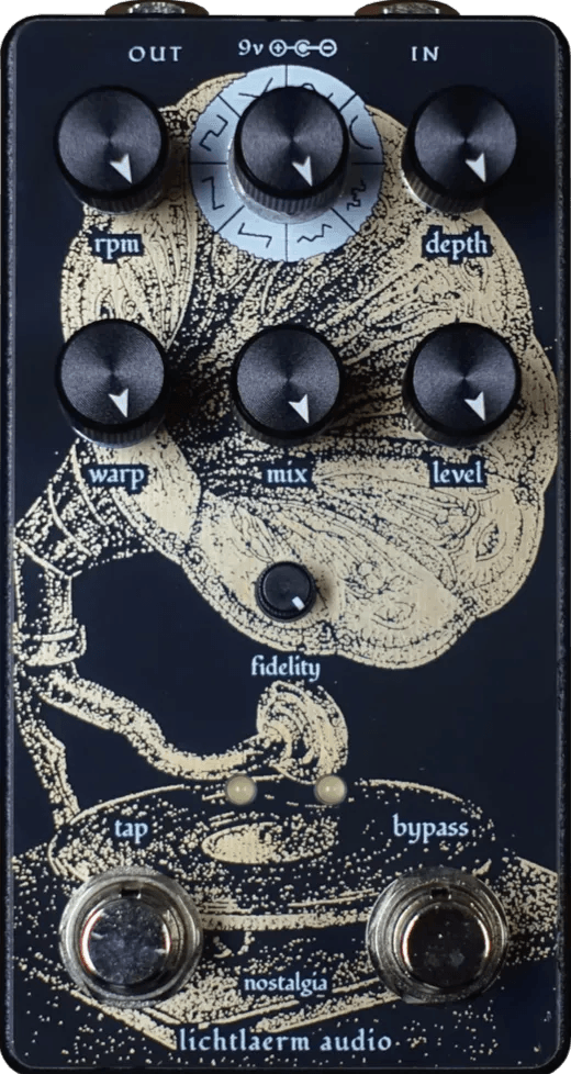 The Nostalgia is a LoFi chorus/vibrato effects pedal designed to deliver modulated textures reminiscent of vintage tape and vinyl recordings. This effects pedal uses a combination of chorus and vibrato modulation circuits to create warble, flutter, and subtle detuning, characteristic of analog playback artifacts. Controls allow the user to adjust modulation rate, depth, and the degree of LoFi artifacts, giving selectable access to tape saturation, vinyl-style flutter, and aged tonal coloration. The Nostalgia effects pedal operates with true bypass switching for signal integrity.