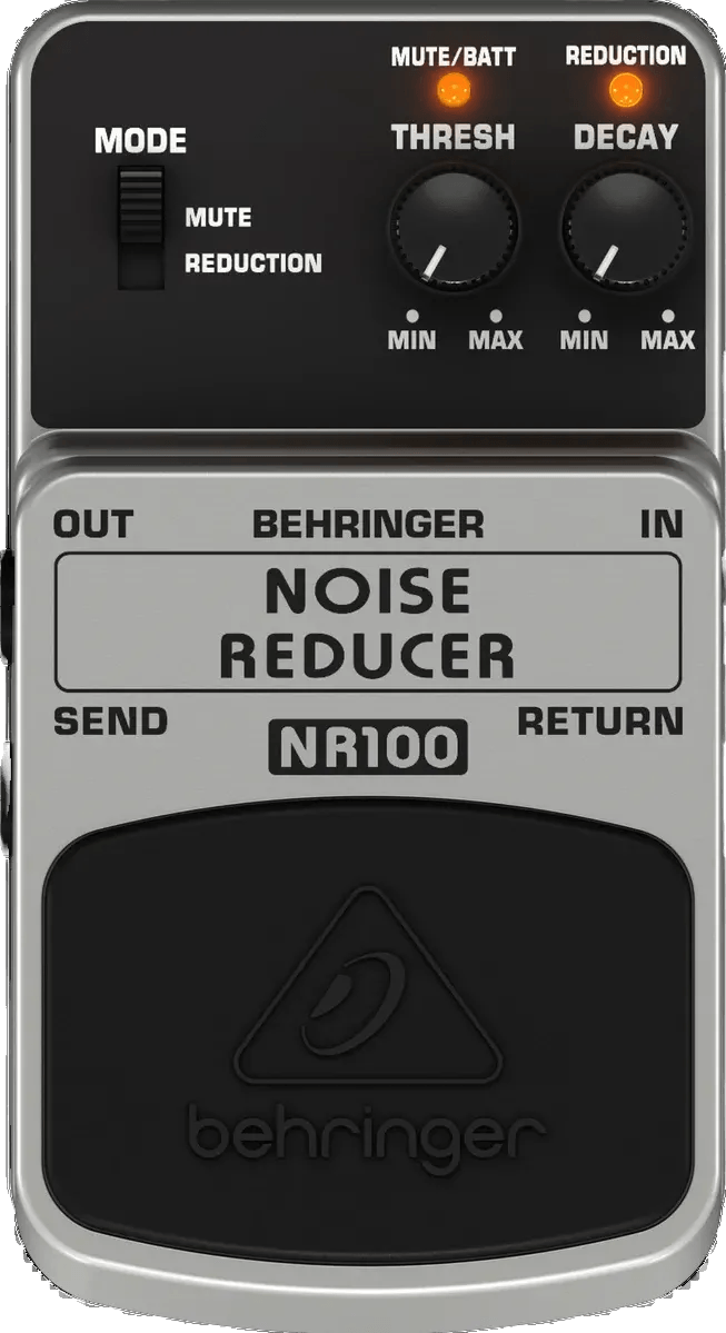 The Behringer NR100 Noise Reducer is a noise reduction pedal designed to eliminate unwanted hum and noise while preserving your audio signal’s tone and dynamics. The pedal operates in two selectable modes: Reduction, which uses adjustable threshold and decay controls to suppress noise, and Mute, which functions as an on/off switch for silent instrument muting.