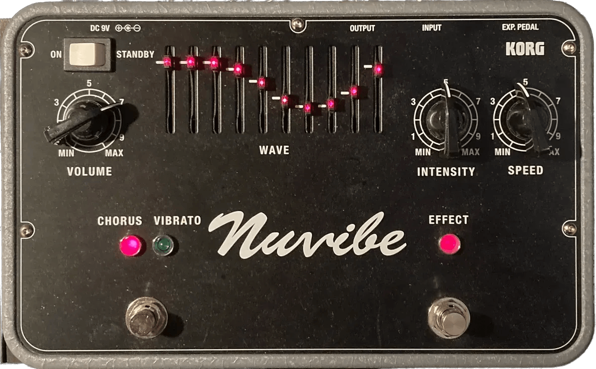 The Korg Nuvibe is an analog modulation pedal designed to recreate the classic Japanese-made sound popularized in the late 1960s. Developed under the supervision of the original engineer, this vibrato/chorus effects pedal utilizes custom circuitry to emulate the unavailable components of the original unit. The Nuvibe also introduces WAVE sliders, which give players the ability to shape and generate unique modulation waveforms beyond the vintage character. This unit features true bypass switching and includes a dedicated expression pedal for precise control over modulation speed in real time. The Nuvibe supports mono input and output, with components selected for reliability and authenticity.