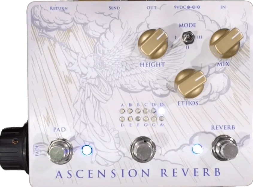 The Eppigaze Audio Ascension Reverb is a multi-mode reverb effects pedal offering Hall, Modulated Hall, and Shimmer reverb types. Designed for detailed ambient layering, it features a dedicated pad sub-signal with adjustable octave content and a volume roller for seamless pad level control. The pedal’s primary controls include Height (decay), Ethos (tone, modulation rate, or shimmer amount, depending on mode), and Mix (wet/dry balance). Connectivity includes an external effects loop for the pad signal, enabling external processing or mixing options. The three-footswitch layout provides master bypass, dedicated pad activation, and key selection for the underlying pad in half-step increments (A to G).