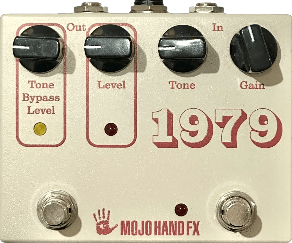The Mojo Hand Fx 1979 is a high-gain fuzz effects pedal modeled after the late-’70s op-amp Big Muff circuit. Designed for pronounced, aggressive distortion, this pedal uses integrated circuits for its gain stage instead of the traditional transistor configuration. The 1979 includes a footswitchable tone bypass that routes the signal directly, adding extended bass, treble, mids, and increased volume. An independent volume knob for the tone bypass mode allows level matching or boost. The gain control features a refined taper, enabling greater adjustability across its range.