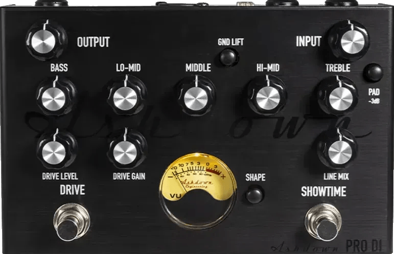 The Ashdown Pro-DI is a bass DI effects pedal designed for direct injection, EQ shaping, and drive control. This unit includes a 5-band EQ with an Ashdown Shape preset for tonal adjustment, and a valve-emulated overdrive circuit with dedicated level and drive mix controls. The Pro-DI incorporates both passive and active input sensitivity settings, allowing compatibility with a range of bass instruments. Level monitoring is provided by an Ashdown VU meter, while dedicated input and output gain controls help optimize signal. The transformer-isolated balanced DI output features a ground lift switch for noise reduction. Additional connectivity includes a line input with separate Line Mix control for blending external audio, suitable for monitoring or practice.