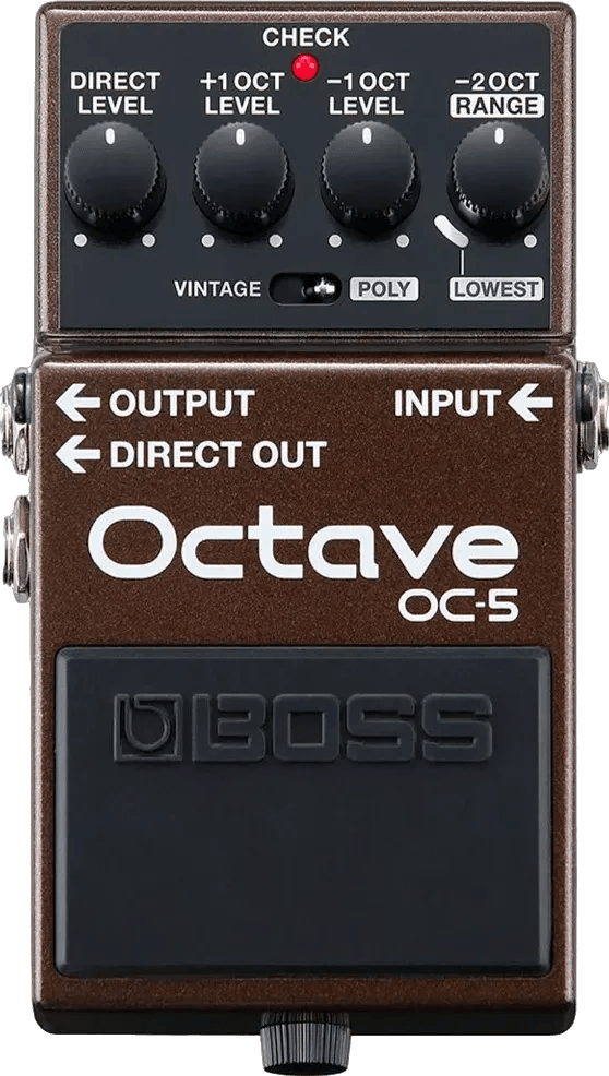 The BOSS OC-5 is an octave effects pedal offering both classic monophonic and advanced polyphonic octave shifting. It features a Vintage mode that authentically reproduces the original mono sound of the OC-2 octave pedal, and a Poly mode with enhanced tracking, making it suitable for chords and extended-range uses. An added octave-up function enables access to tones spanning three octaves, with blendable low and high octave controls for versatile tonal shaping.