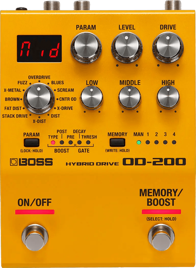 - BOSS overdrive/distortion pedal with hybrid analog/digital circuitry