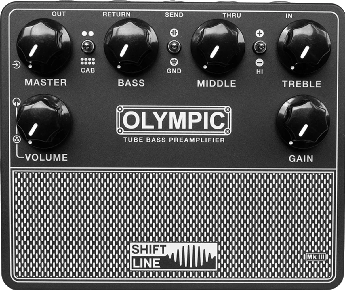 The Shift Line Olympic MkIIIS is a tube bass preamp pedal designed to deliver classic tube-driven sound along with advanced audio processing. This pedal integrates impulse response (IR) cabinet simulation technology, providing detailed emulation of classic bass cabinet tones. The MkIIIS includes two onboard IR cabinet emulations—SUNN 200s 2x15 and AMPEG SVT-810E 8x10—with the option to load additional IRs via a microSD card slot. Featuring a compact enclosure, the Olympic MkIIIS offers flexible connectivity options suitable for integrating into various signal chains. Its design retains the analog warmth and dynamic response of tube preamps, while providing modern features for studio and live use.
