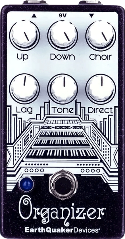 The EarthQuaker Devices Organizer effects pedal is a polyphonic organ emulator that blends analog and digital circuitry to generate church organ-inspired tones from a variety of instruments, including compatibility with bass. It processes both chords and single notes, delivering harmonically-rich effects while maintaining an all-analog dry signal path. This organ-style pitch shifter pedal features true bypass switching, with the V2 model utilizing a relay-based soft-touch footswitch for silent operation. Audio signal does not pass through the pedal when it is unpowered.