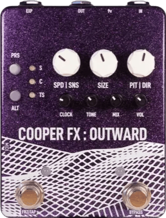 The Outward is a digital sampling effects pedal that captures incoming audio and replays it using multiple processing modes. This pedal provides audio freeze, stutter, and time-stretch effects, enabling a range of creative sound manipulation options. Depending on the selected mode, the Outward can sustain input signals, slice and repeat audio segments, or alter playback speed and pitch. The device features straightforward controls for live sampling and offers hands-on operation for real-time effect changes.