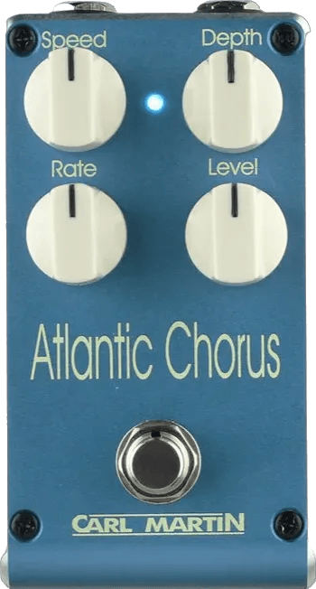 The Carl Martin Atlantic Chorus is an analog chorus effects pedal designed for lush modulation effects, featuring a compact, pedalboard-friendly enclosure. This chorus pedal includes dedicated controls for Level, Depth, and Rate—unusual among chorus effects pedals, the Level knob allows for adjustable signal boost. The Rate control also functions as a blend, introducing vibrato into the modulation for extended sound-shaping capability. Input and output jacks are positioned on the top panel for streamlined pedalboard integration. The Atlantic Chorus features true bypass switching to preserve signal clarity.