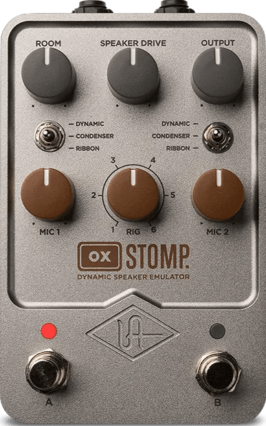 The Universal Audio OX Stomp Dynamic Speaker Emulator pedal offers cabinet simulation, microphone modeling, and room ambience for effects pedalboards and amp modeler setups. This speaker simulator pedal provides a range of accurate cab, mic, and room models along with built-in, studio-grade effects. The unit integrates as a pedalboard-format cab emulator, designed for direct amp modeler signal chains or other digital setups requiring realistic speaker and room tones.