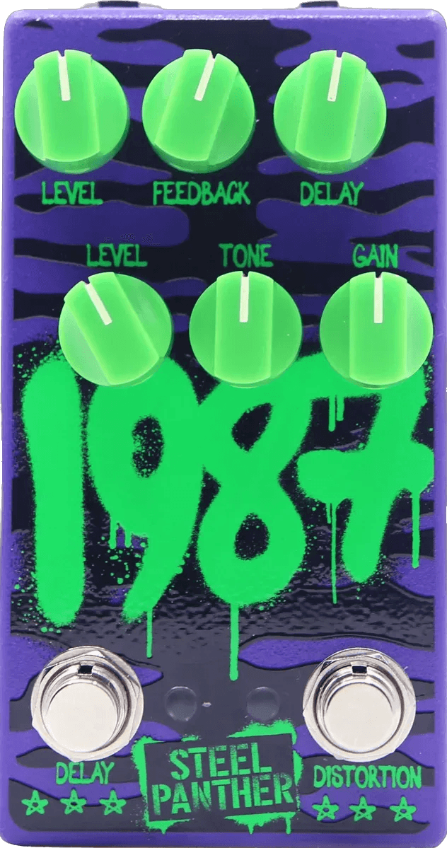The All Pedal 1987 Steel Panther is a dual-function effects pedal that combines high-gain distortion with an onboard delay circuit. Designed to recreate tones characteristic of late 1980s hard rock, this distortion and delay pedal provides players with control over both drive and echo parameters. The pedal features dedicated knobs for gain, tone, level, delay time, and feedback, allowing for precise adjustment of both effects.